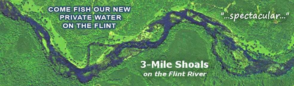 We're really happy to offer you the opportunity to fish this completely private water on the Flint River. Surrounded by 2600 acres of property, we have exclusive fishing rights to one of the longest and best set of shoals on the river. Virtually inaccessible, the only real access is by overnight paddlers who may pass through - most days, even on the weekend, we see no one.