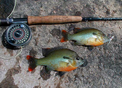 The red-breast will take the same flies as the shoal bass. Sometimes they will be in the same water as the shoalie or perhaps in slower spots. Anywhere you see sand is apt to be a good red-breast spot. Fishing two flies will often result in a double hook-up (as shown at right) - these guys are nothing if not aggressive.