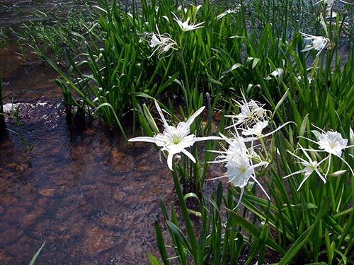 Summer also provides a beautiful show on the river - hundreds and hundreds of spider lilies in bloom. They flourish in the rocky shoals and are truly spectacular. So when the mountain trout are sulking in the heated water and the lake bass have all gone deep, wade the cool shoals of the Flint and enjoy our rarest native game fish.