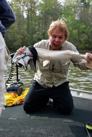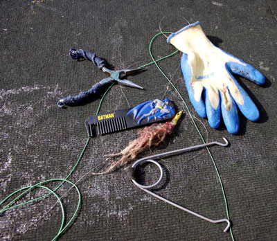 Removing the fly from the fish may be the hardest part of the whole proposition. You'll need something to hold his mouth open and a stiff brush to pull the fibers from his teeth. A glove or a towel will help you hold the fish - the scales can cut and the fish is very slick and very strong. Note the teeth - hundreds of them & very sharp - I suggest a sturdy glove. I like a big screw-driver and a jaw-jack designed for pike and musky. Some anglers use a home-made wooden jig to hold the mouth open. Regardless, maintain a firm hold on the fish throughout - they'll "play possum" and then explode when you least expect. The fly will be a tangled mess - no problem, just comb it out a little and it'll still work just fine.