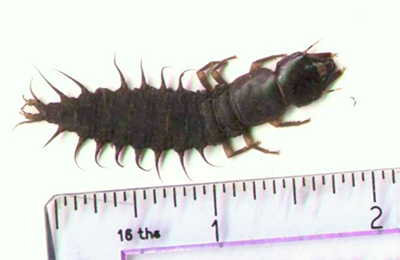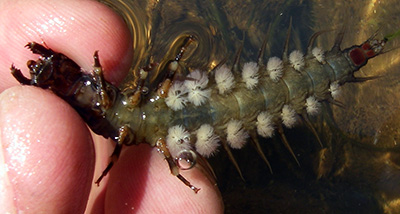 Hellgrammites "meaty, beaty, big & bouncy..." Hellgrammites are the aquatic larval stage of the dobson fly and live three years before emergence. As they near maturity they crawl out of the water and burrow in the soil or decaying wood where pupation takes place. The adult dobson is a monstrous flying beast with a 4-6" wingspan. They are seldom seen as they emerge at dark, fly little and live only two or three days to deposit their eggs on limbs or rocks that overhang a current lane. Hellgrammites primarily burrow into weeds & gravel in search of prey, but are in the stream year-round and are often available to fish. And they are definitely a mouthful! On the Flint River, they are a favorite of the shoal bass and the bait fisherman. You can find them deep in the submerged grass and moss. If you wonder why the shoalies are often down in the rocks burrowing in the moss, this is the reason. The hellgrammite has short powerful legs plus gripping hooks on the last abdominal section. Mainly crawlers and clingers, they dive for the bottom when swept by the current. The hellgrammite has large lateral gill filaments, gripping hooks on the last abdominal section, and large biting mandibles on the head (and they will bite!). They are unusual in that although they are generally aquatic, taking in dissolved oxygen through abdominal lateral filaments and tracheal gills, they also have spiracles that allow them to take in air directly when above water. Often, "realistic" fly tiers try imitate the lateral filaments (see top photo) as they appear to be the most obvious feature of the bug. That is true when the hellgrammite is out of the water. Once in the water, however, the tracheal gills bloom and glow in bright white (see 2nd and 3rd photos). Though I have tied dozens of experimental flies attempting to imitate the fluffy white gills, a grizzly-hackled, black wooly bugger works at least as well. I weight the flies so they ride hook point up and fish them near the bottom on a dead drift.