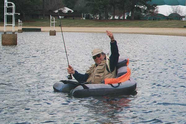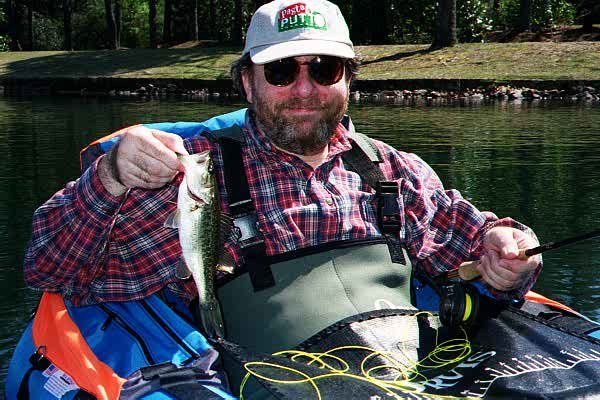 February 7 - Callaway Gardens - 7 am - Decathalon going on this morn, so I fished Wren as access was easy. As I walked up to the lake and dropped the float tube, I saw a couple of swirls out in the lake. I'd rigged my rod at the car, so I quickly shot a cast out. The green sparkle beaded wooly bugger statrted to sink and then line straightened and came tight. There was definitely some weight there and he took off - I figured trout. When I got him up, turned out to be a big "whiskered trout"(ie, catfish). Don't let the old scavenger, bottom-feeder talk fool you, the cat is a game fish (but I'll fish for anything). Weather and water was perfect - fished in shirtsleeves and took several trout, 2 largemouth and a couple of bluegill.