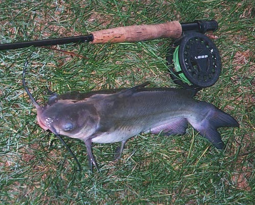 May 9 - West Point Lake - 6 pm - Yellow Jacket Creek - Fished the bridge rip-rap and found only one small spot. Moved to hooked cove to avoid jet-boat & bass-master wakes and took several largemouths of docks on windblown side. Way in the back of the cove I saw carp wallowing in the flooded grass. Still excited about a 39" grass carp a week ago, I thought I'd try the "common" variety. Eased the boat back in there and tied on about 4' more tippet and a rubber-legged dragon. `Chose the fly because it's small, rides hook up, and seldom fouls. Threw it right up in the grass and let it sit til a carp was right in front of it, then bumped it just a tad. The carp took, and then took off. The bow of my boat was mired in the bank, the stern in about 1.5 ft. He ran thru the grass, back around and under the boat. I had my rod (the whole rod, handle & all) down in the water pointed at him as he headed for deeper water. Finally manipulated it free (a Laurel & Hardy act) and played him to the boat. He wasn't near as big as my grass carp last week, but let me tell you, this "common" rough fish will pull just about any other freshwater fish backwards across the lake.