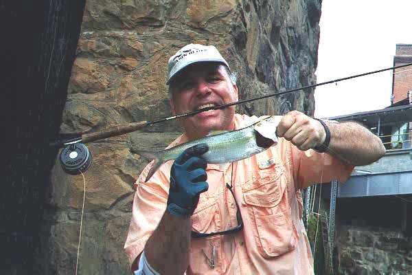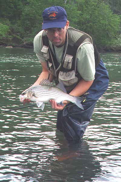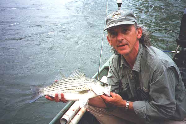 April 6 - Chattahoochee River - 6 am - Fished the Hooch in Columbus with Dave B., aka "Hooker". As trips with him always are, this was an adventure. Jetboating the rapids upstream right to the discharge dams of a huge mill, we caught big hybrid til the sun got up. Then the "skipjack" moved in. These are ocean fish who've run upstream from the Gulf to spawn. We caught exactly 200(Hooker always counts - I was having too much fun) and quit at about 2:00. When we'd hit 100 skipjack, Hooker even laid down his spinning rod & strung up the Sage, so the second 100 were all on the fly (mainly clousers).`Got a copy of Hooker's new book, An Angler's Guide to the Atlanta Chattahoochee River. If you fish around Atlanta & don't have this book, you're missing the boat (& the fish!). Get it!.