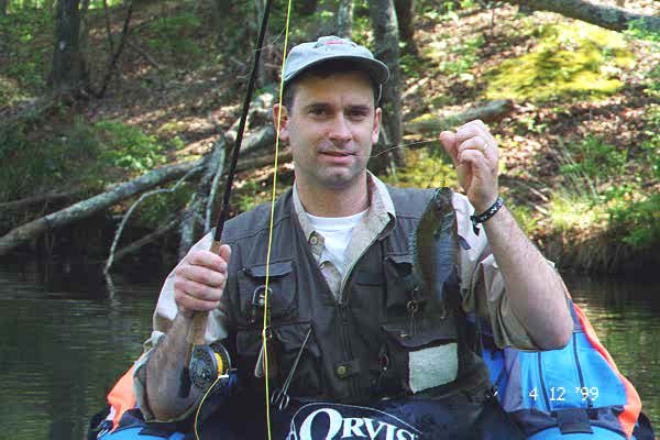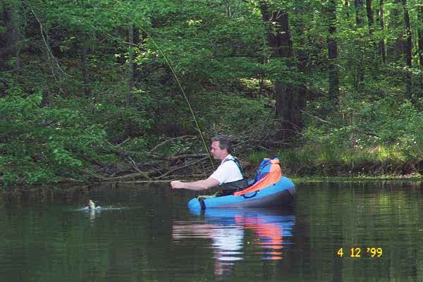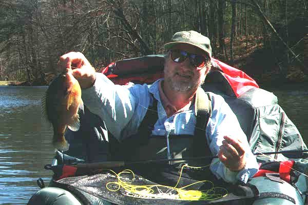 April 18 - Callaway Gardens - 2 pm - Fished with Mike W. and his wife, Marie. Vets of West Point Lake and conventional tackle but new to flyfishing. We did a quick casting lessons and hit Hummingbird Lake to avoid the winds. If you know Callaway it's that beautiful, long, narrow lake surrounded by woods on 3 1/2 sides right at the 3-way intersection in the Gardens. The "NO FISHING" sign beside it makes it look even prettier. We took big bluegill and redbreast on poppers, plus one big bass on a wooly bugger. `Really nice folks who, I bet, will be flyfishing some more.