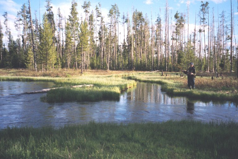 June 8-13 - Last Chance, Idaho - Spent 5 days fishing with Norman P. on the Henry's Fork and surrounding streams. Legendary country, and with good cause. Oh, the rivers!!! And the little creeks !!! Salmonflies were moving on the Henry's Fork and we threw stimulators as big as bass bugs. Water was still up everywhere, but the fishing was still plenty good. Highlight is hard to choose. Maybe the float down the Fork, machine-gunning casts to the bank as we raced with the current, and seeing the flash of the trout as he came up to blast the salmonfly. Or maybe the wading along the Firehole in Yellowstone, with the geysers spewing steam and boiling water, and those wild trout who seemed to love the prince and "bite-me flash" nymphs. Or maybe it was the little nameless winding 4' creek down below Big Springs with little wild brookies nestled up next to the meadow bank. Suffice it to say, I'll be back there. And if you haven't been, make plans. I think you could fish new water there for years, and, from what I saw, love it all.