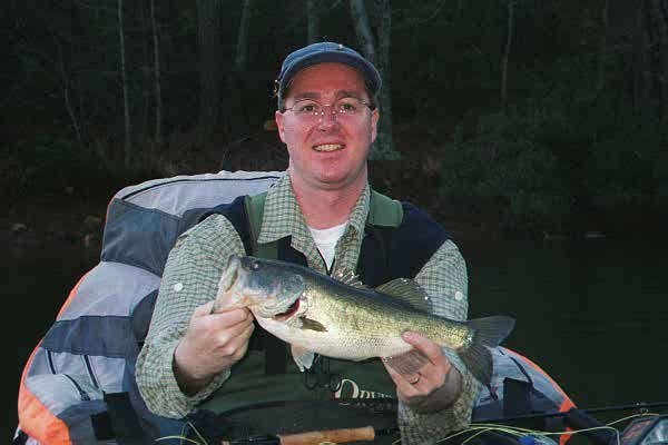 February 10 - Callaway Gardens - 7 am - It's not really February - that's just what the calendar says. According to the fish it's sometime in April. Fished Bluebird early in the am. Carried 2 rods in the float tube (one with a full-fast sink line), planning to plumb the deeps and find the big ones. `Turned out the big ones were not in the depths, but rather in the shallow cove about 6" off the bank. `Took 4 nice bass (one about 17"), plus 11-12" bluegill starting to show spawn colors. Took out for lunch and moved to Hummingbird Lake. Caught a few bass and bream, again fairly shallow. Then found some big bluegills hanging on little artificial island. Trick was to toss fly right against the island and let sink. Took four big hump-headed ones this way, then what I thought was another. `Thought, that is, until I put on a bit of pressure and the line took off, straight down, against the island pier and he was gone. Hummingbird is about the smallest lake here, but there's a VERY big fish there - I'll be hunting him. Late in the afternoon, I moved over to Wren (the trout lake). Fish were hitting the surface and chasing bait in shallows. `Casting from the bank, I took, on 3 consecutive casts, a bass, bluegill and trout. Checked the water temp in the shallows (on this sunny north bank) and it was seventy degrees. No wonder the bass are shallow - they think it's time to spawn. `Just for the heck of it I tied on a foam slider (Carter Nelson's foam-head wooly bugger) and took 4 bass (and missed a dozen) casting to swirls and spalshes. The bass were bashing the topwater - wake up, it's the middle of April.