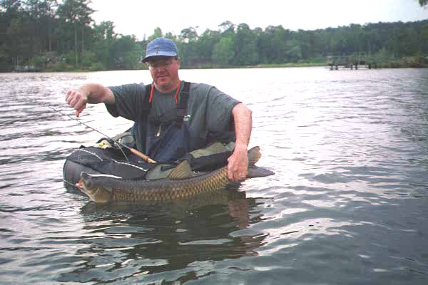 April 28 - Private Pond, LaGrange - 4:30 pm- Fished w/Norman P. at a local pond from float tubes. We'd heard bass/bream were great here. Fished around the bank aways and picked up only a few, including 2 nice bass.On the windy side of a shallow island, we saw the fins, tails and sipping mouths of huge white amur (grass carp). We cast tied on dry flies and edged within casting range. Luckily, the wind was rippling the surface of the water and the fish were less spooky than normal. The trick lay in anticipating their direction of travel and casting just in front. I saw a tail right near the bank and cast about 6' in front of it. As my fly (#8 tarantula) landed , I saw a mouth open and lightly twitched the fly. The water exploded, as about a dozen carp blasted from the shallows - one of them firmly attached to my fly line. These fish grow big (sometimes comsuming their body weight in vegetation in a single day) and are very strong. From a float tube the initial part of fighting a carp is basically a matter of holding on for the ride. After quite some while I could get him close to the tube, but then he'd see me and give a quick flick of his tail (dousing me with about a gallon of water) and was gone again. Finally I was able to land him and hold him against my chest like a bag of cement )for Norman to snap a photo. Right at 39", I have no idea of what he weighted but am almost glad he wasn't any bigger.