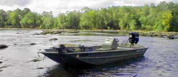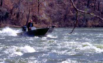 The Season On this section of the Hooch, prime time would have to be considered as winter through early spring. When it's cold, the shad often move to the upper ends of the lake and into the river seeking warmer water. Where the shad go, the stripers will follow. When the upstream dams begin power generation and the water rises, the shad get pushed downstream and the stripers often attack in the churning water of shallow shoals. Summertime and high water temperatures will also bring the stripers into the shoals at times. They like cool water and especially the high oxygenation of the water in the shallow shoals. There are a couple of photos here of wading anglers, but be advised extreme caution is needed if you wade - water levels rise quickly and bring big trouble without the right boat. The spring spawning run also brings good striper fishing. The spawn varies depending on the section of the river, but usually ranges from mid-March through April and maybe into May.