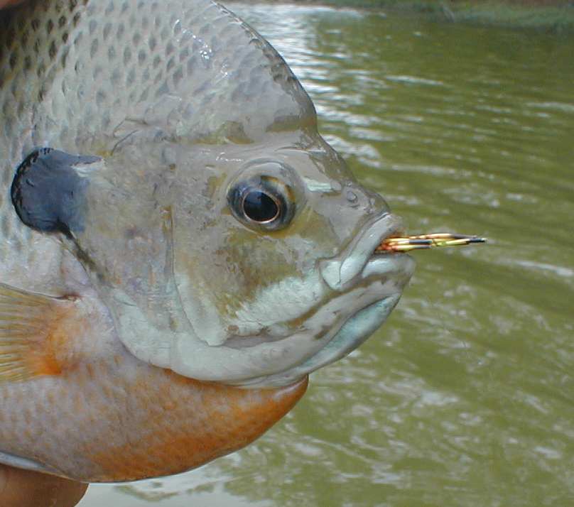That spider is terrific for average size bream - but I wanted something for the giant bream at Callaway, something I could see from a distance, and something big enough to entice not only the bream, but bass too. A Japanese sci-fi-movie spider, if you will, like "The Spider That Ate Tokyo"! Cast it as close to the bank or wood as possible, and let it sit a long time. How long? To quote Dave Whitlock, "Don't let the hook rust." Twitch it once and let it sit again. Because the foam is not tied down at the hook bend but kind of sticks up in the air, the fly still rides low in the water and can be worked with the little rippling twitches that bream (and bass) find so irresistible. But with the large mass of foam it can also create quite a disturbance on the surface with a hard strip - just the ticket if you're bream fishing slow and easy down the bank and suddenly see a big bass blow up.