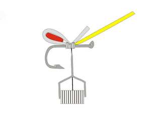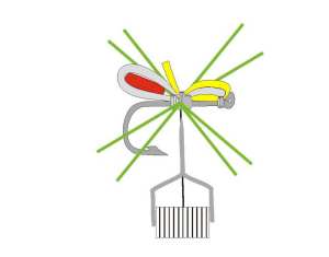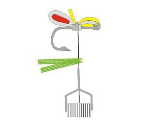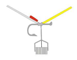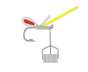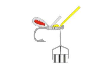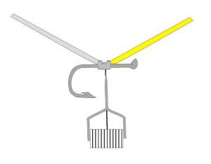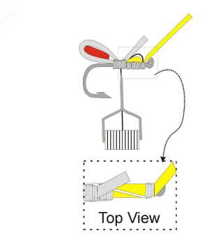 Attach two foam strips just in front of the hook point, one pointing back and one forward. In the drawing, the colors contrast but could be the same - your choice. The fly in the photo above uses black in the rear and yellow in the front.