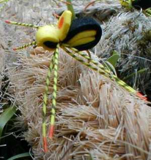 The fancy striping on the rubber legs is a trick I learned from Ward Bean . Tie in solid-color legs as usual. Pinch the end of the leg between your thumb and forefinger, and twist and stretch them. Run a magic marker down one side and release. Voila! - a barber-pole stripe in your choice of colors. Add a second color if you want. Twist in the opposite direction and the stripes will criss-cross.
